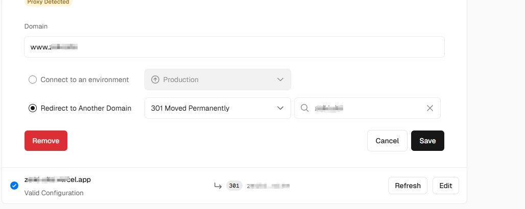 如果是使用vercel部署,是在设置中的域名配置这里,然后选择编辑301到非www域名,我通常也会把vercel分配的那个子域名301到非www域名,但是不是必选。