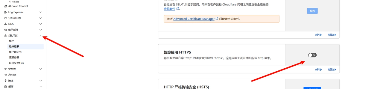 首先我会把自己的所有域名都几种代理到cloudflare上面,然后SSL配置也比较简单,在对应域名的SSL配置中开启"始终使用HTTPS"开关即可。