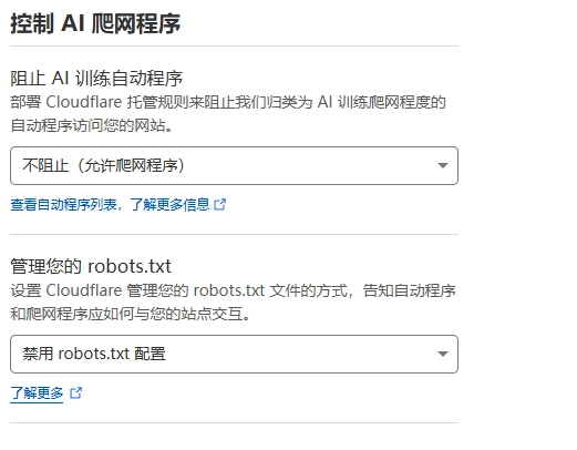 第三件事,关闭cloudflare对于robot文件的代理和ai爬虫的限制,